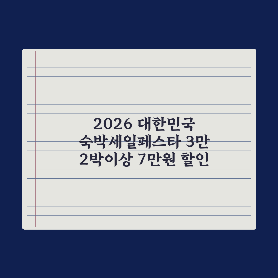 참고 포인트: 2026 대한민국 숙박세일페스타 3만은 전국 숙박업계 활성화와 여행 수요 촉진을 목표로, 다양한 할인과 편리한 예약 시스템을 통해 소비자 혜택을 극대화하고 있습니다.
